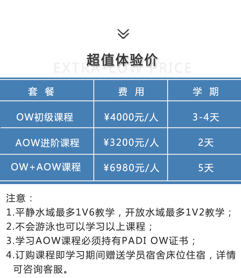 产品简介 : 广东深圳大鹏PADI潜水考证OW+AOW课程培训课程学习。PADI与CMAS双系统资深教练亲自教学,通过率99.9%。超小班教学,并赠送学习期间食宿,上课期间专车接送。费用透明,一价全包,更多优惠信息请咨询客服。